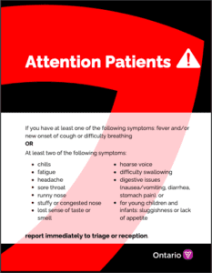 Use this latest guidance from the Ontario Ministry of Health to monitor yourself for symptoms. If you say ‘yes’ to any of these, please cancel your appointment with us – you will not be charged. Go to a COVID testing centre (the closes to our clinic is being held at the Branson Site of North York General Hospital).